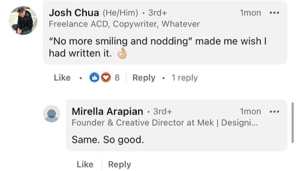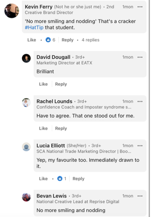 As part of the Economist copywriting assessment, my lecturer posted some of out adverts onto LinkedIn on his personal account. Below are some of the comments on my “No More Smiling and Nodding” advert specifically.